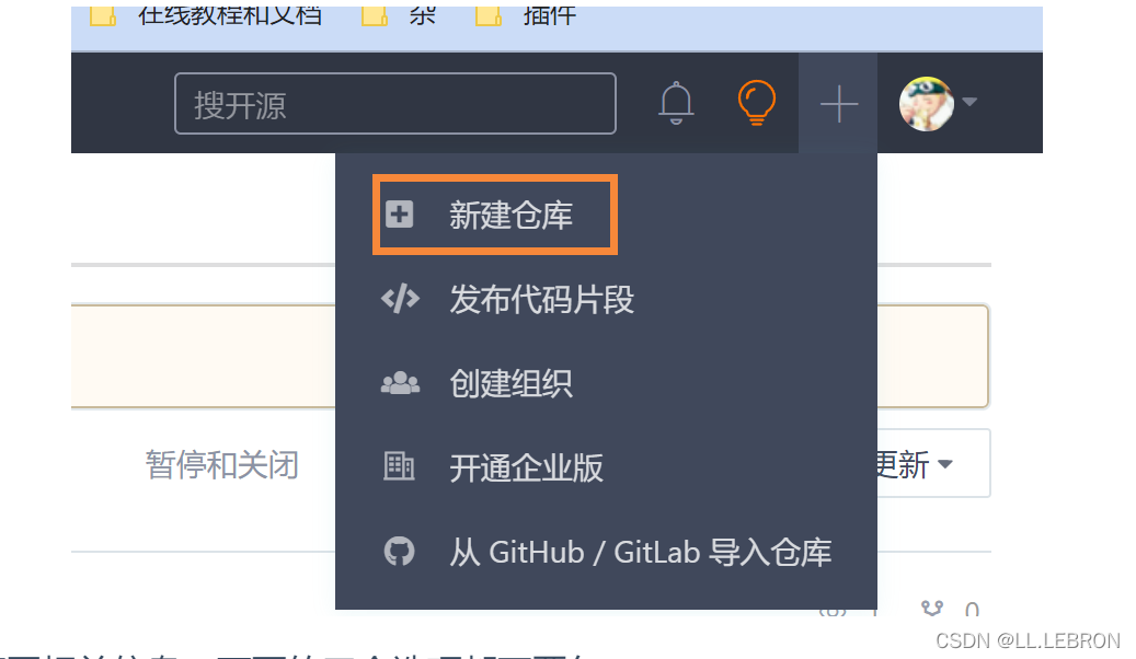 1.通过网站右上角的「+」号,选择「新建仓库」,进入新建仓库页面