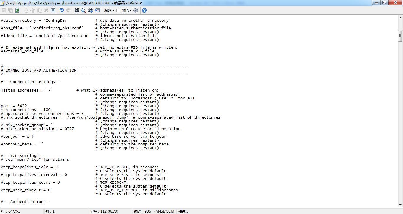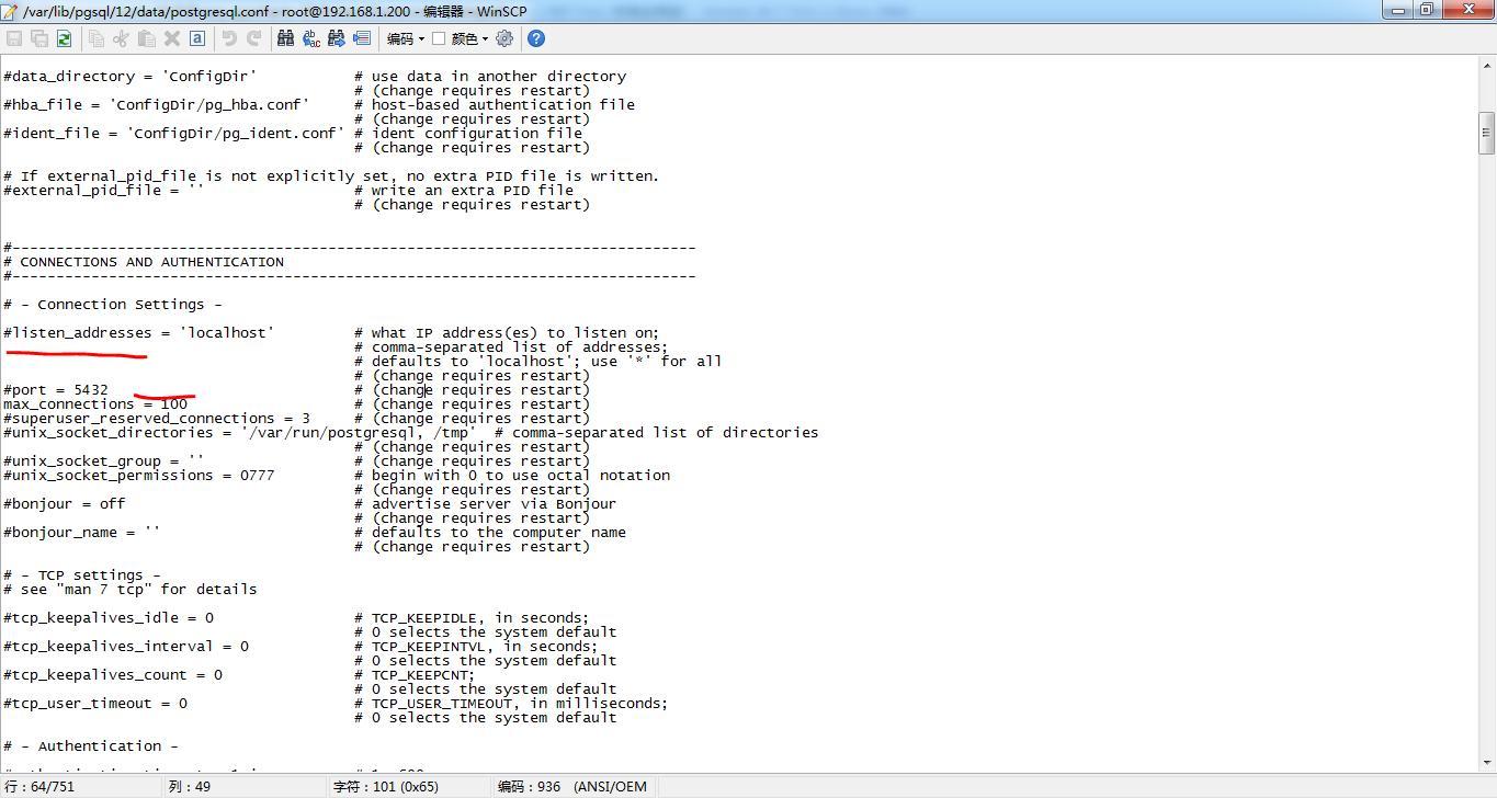 为了PostgreSQL可以远程访问,还需要配置postgresql.conf和pg_hba.conf,比如: