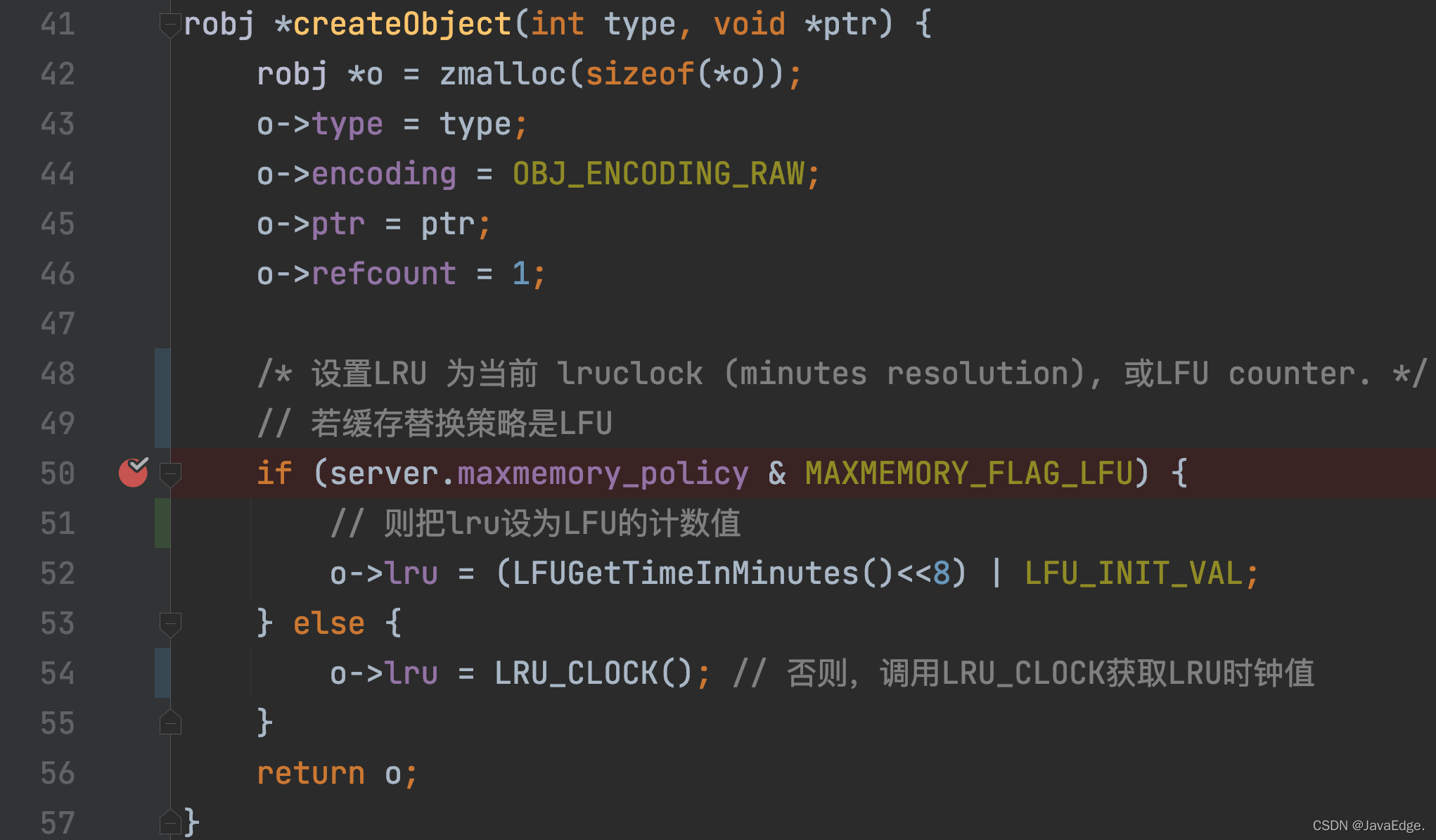 createObject除了会给redisObject分配存储器空间,还会根据maxmemory_policy配置,初始化设定redisObject.lru,