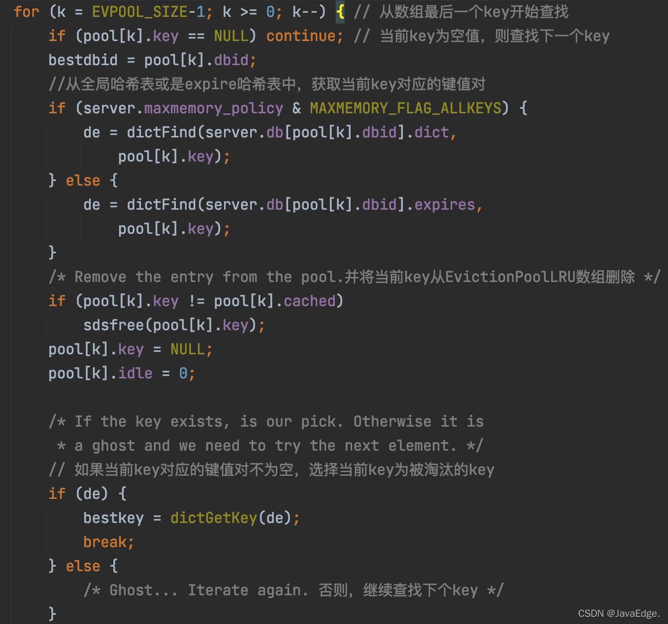 performEvictions在淘汰资料的回圈流程中,就会更新这个待淘汰的候选KV对集合,即EvictionPoolLRU阵列,