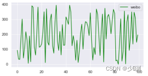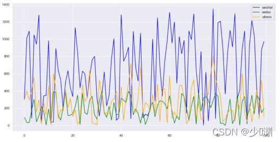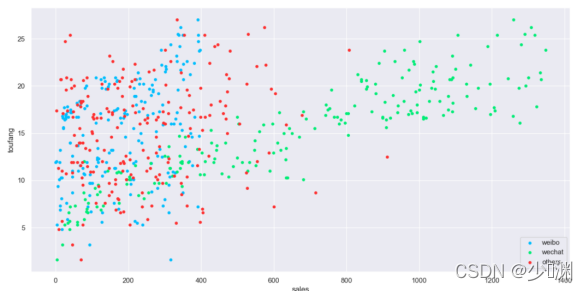 当我们打开Excel档案的时候,得到的是一系列的资料,一共201行,4列;第一行是标签的信息,包括微信、微博、其它和销售额(前三个是投放),底下的二百行是不同的投放量和对应的销售额,如此看来不是很直观,我们可以通过matplotlib将资料可视化出来,另外,为了使绘制的图更好看,我还使用了seaborn库中的set函式,
