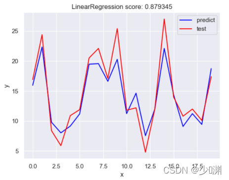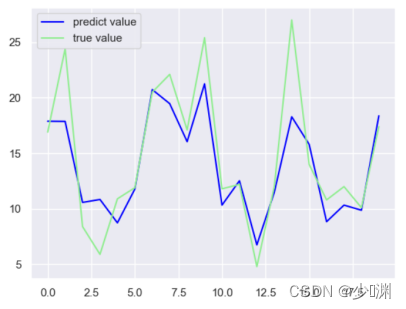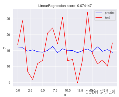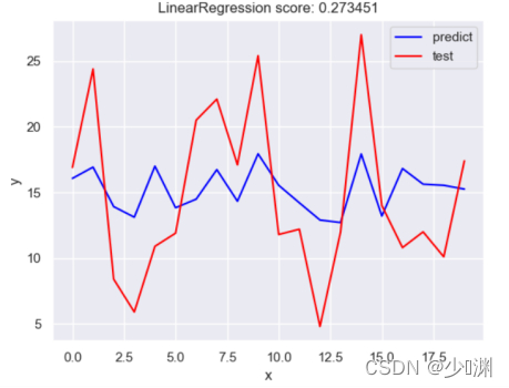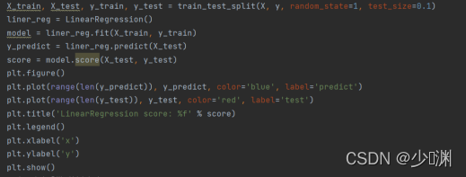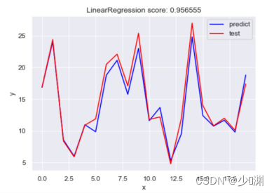 首先,我们通过pandas库读取csv档案并分别获取投放量和销售额的信息,然后我们通过sklearn.model_selection中的train_test_split将资料分割为测验集和训练集,在此我定义测验集的比例为0.1,因为我首先选择使用最简单的线性回归进行预测,所以我们还要汇入LinearRegression并且通过fit函式对模型进行训练,训练之后,为了检测结果的耦合程度,我们利用测验集的X_test通过predict函式产生一个预测的y_predict,然后和真实值y_test进行比较,为了使结果更形象,我们可以绘制一个折线图,并且通过sklearn库中封装好的score函式对模型进行评分,然后呈现出来,