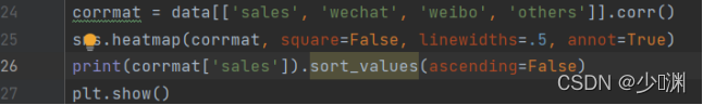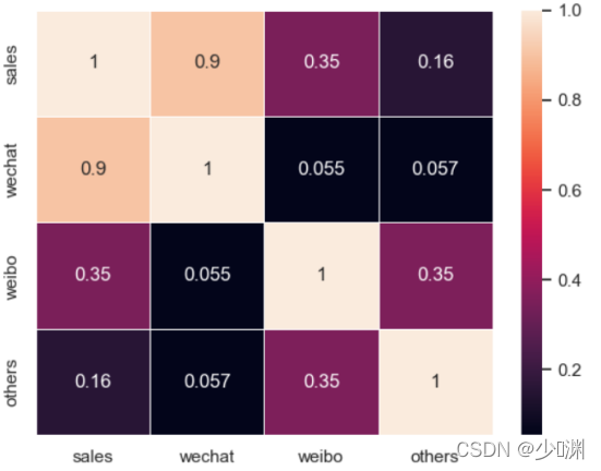 观察到如此大的差异后,我们再用回归系数观测一下三种投放量对销售额的影响程度:我们可以通过seaborn库中的heatmap热力图来绘制相关性矩阵热力图,比较各个变量之间的相关性: