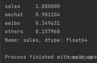 颜色越浅代表相关性越大,图中可以看出微信对销售额的影响最大,其他对销售额的影响最小,为了让图反应出的信息更加直观,我们可以直接打印出相关性的排名如下: