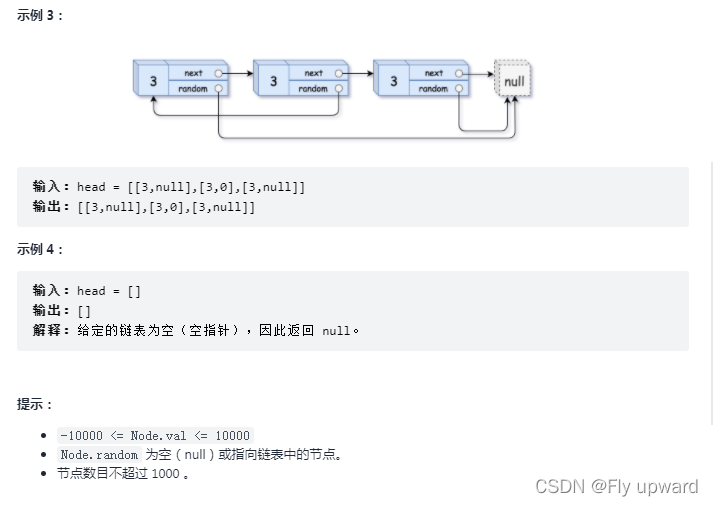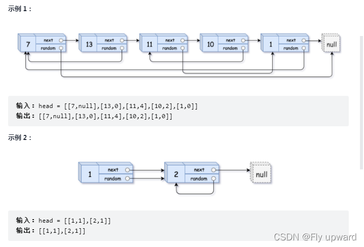 请实作 copyRandomList 函式,复制一个复杂链表,在复杂链表中,每个节点除了有一个 next 指标指向下一个节点,还有一个 random 指标指向链表中的任意节点或者 null,